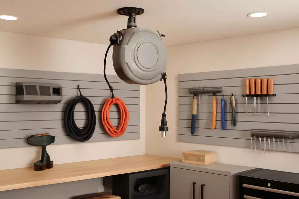 Integrate cord reels into a larger workshop layout. Pair them with pegboards, slatwall panels, and ceiling-mounted hoists to distribute tools and accessories logically around your workspace. A cohesive system reduces movement and saves time during projects.