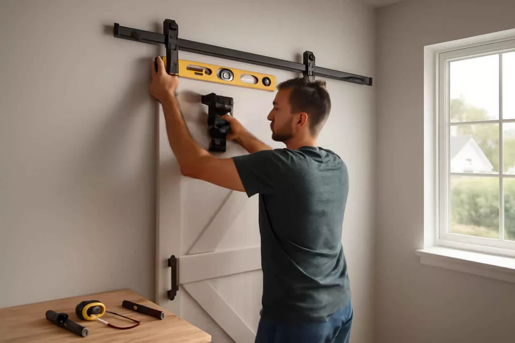 Start by measuring the width and height of your doorway opening. Add extra clearance—typically 2 inches on each side—to account for wall space and hardware brackets. Measure door panel thickness to choose the proper track length. Mark the track height at least 1½ inches above the door’s top edge so it slides freely. Use a laser level for precision—see our guide on How to Use a Laser Level for Installing Floating Shelves to master straight-line measurement.