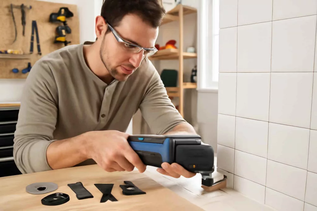 Select a carbide grout removal blade for tile joints, a bi-metal flush-cut blade for trim and molding, or a triangular sanding pad for smoothing surfaces. Check manufacturer recommendations for speed ranges—generally, harder materials need slower speeds to avoid overheating.